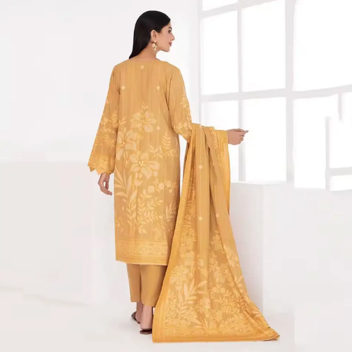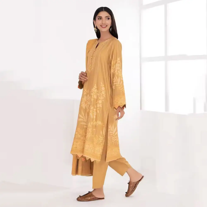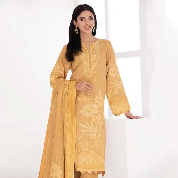 “Soft winter fabric mein bana yeh yellow kameez shalwar aap ko deti hai warm, stylish aur bright seasonal look. Comfortable fit aur elegant design isay daily wear aur casual outings dono ke liye perfect banata hai.”
